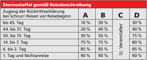 (3) Wählt Schnurr Reisen eine pauschale Berechnung der Entschädigung, kann Schnurr Reisen die folgenden Entschädigungspauschalen ansetzen. Schnurr Reisen hat die Entschädigungspauschalen unter Berücksichtigung des Zeitraums zwischen der Rücktrittserklärung und dem Reisebeginn sowie der zu erwartenden Ersparnis von Aufwendungen von Schnurr Reisen und des zu erwartenden Erwerbs durch anderweitige Verwendungen der Reiseleistungen festgelegt. Die Entschädigungspauschale wird nach dem Zeitpunkt des Zugangs der Rücktrittserklärung bei Schnurr Reisen wie folgt mit der jeweiligen Stornostaffel berechnet: