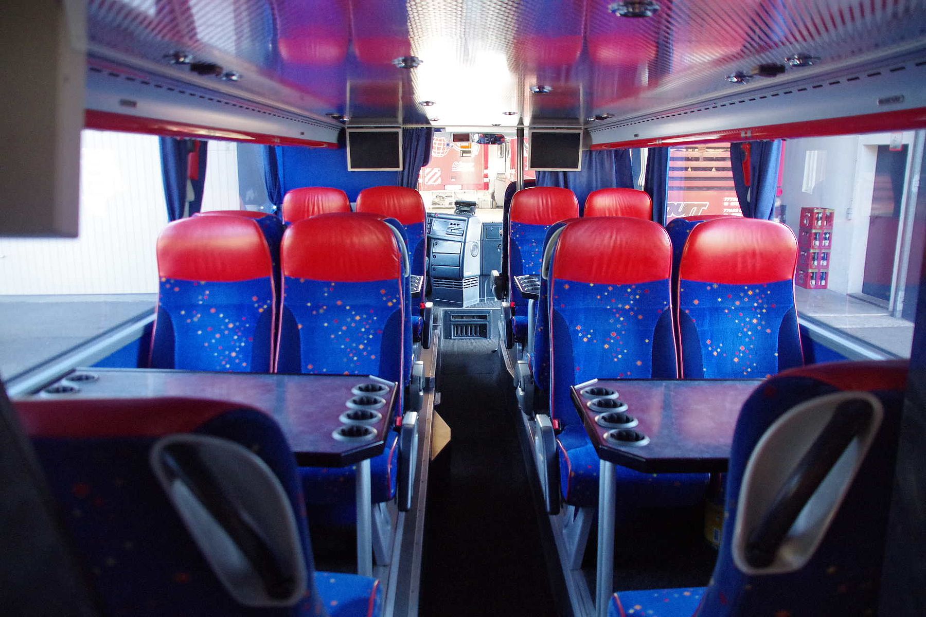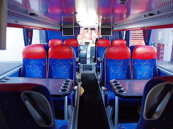 Toilette, Klimaanlage, Reisebestuhlung, Fußraster, Bistro-Küche/Kaffeebar, große Kühlschränke, CD-Radioanlage, DVD-Videoanlage, Navigation