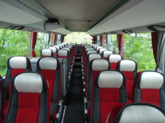 Toilette, Klimaanlage, Reisebestuhlung, Fußraster, Küche/Kaffeebar, CD-Radioanlage, DVD-Videoanlage, DVBT-Fernsehempfang, I-Pod, Laptopanschluss, 3 große Flachbildschirme, Navigation, sehr großer Kofferraum