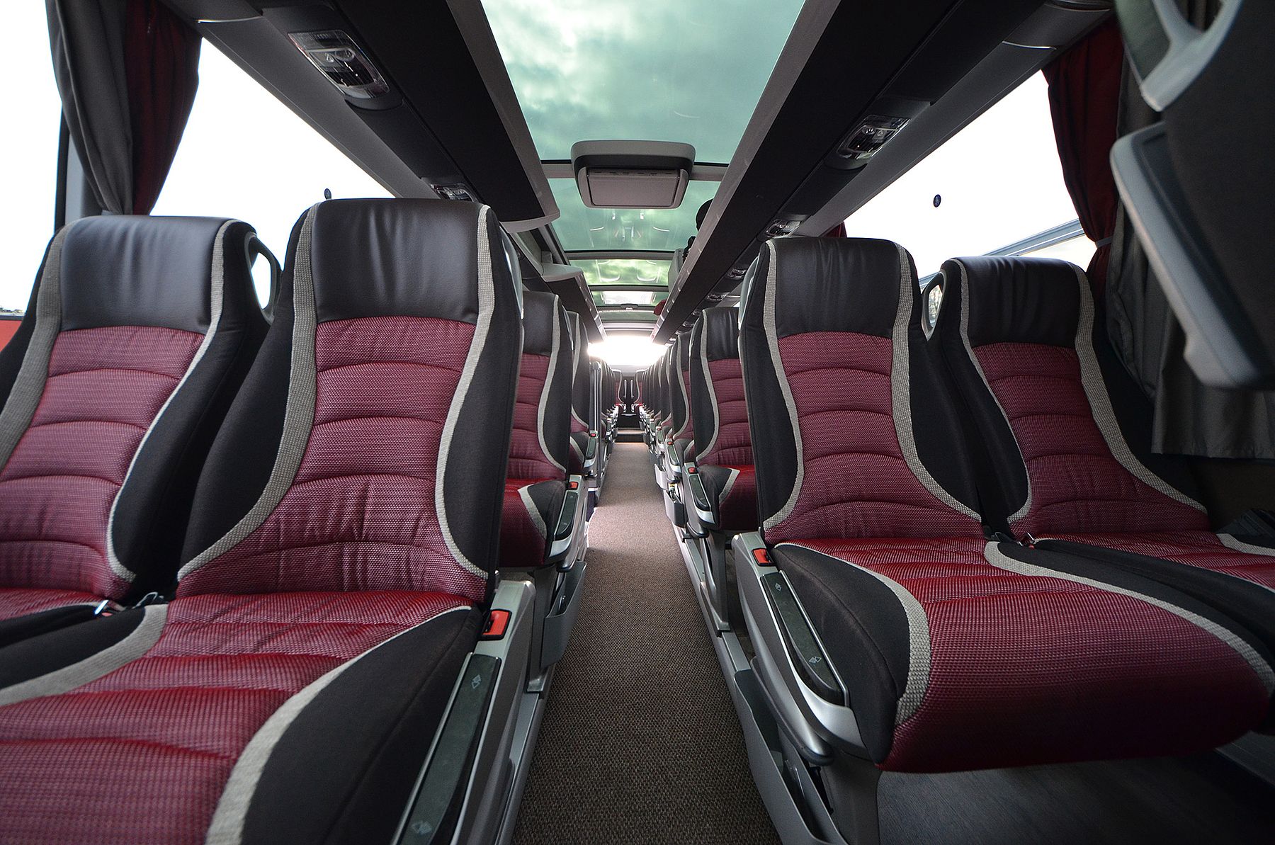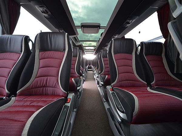 Toilette, Klimaanlage, Reisebestuhlung, Fußraster, Küche/Kaffeebar, CD-Radioanlage, DVD-Videoanlage, Navigation, großer Kofferraum, Glasdach.